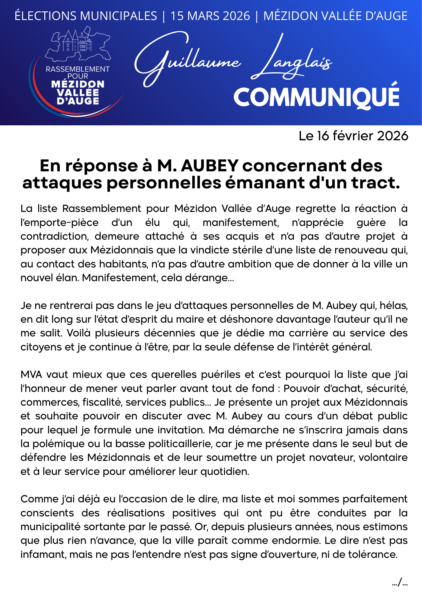 Article de presse du journal "Ouest-France" le 24 février 2026 concernant la présentation de la liste "Rassemblement pour Mézidon Vallée d'Auge"