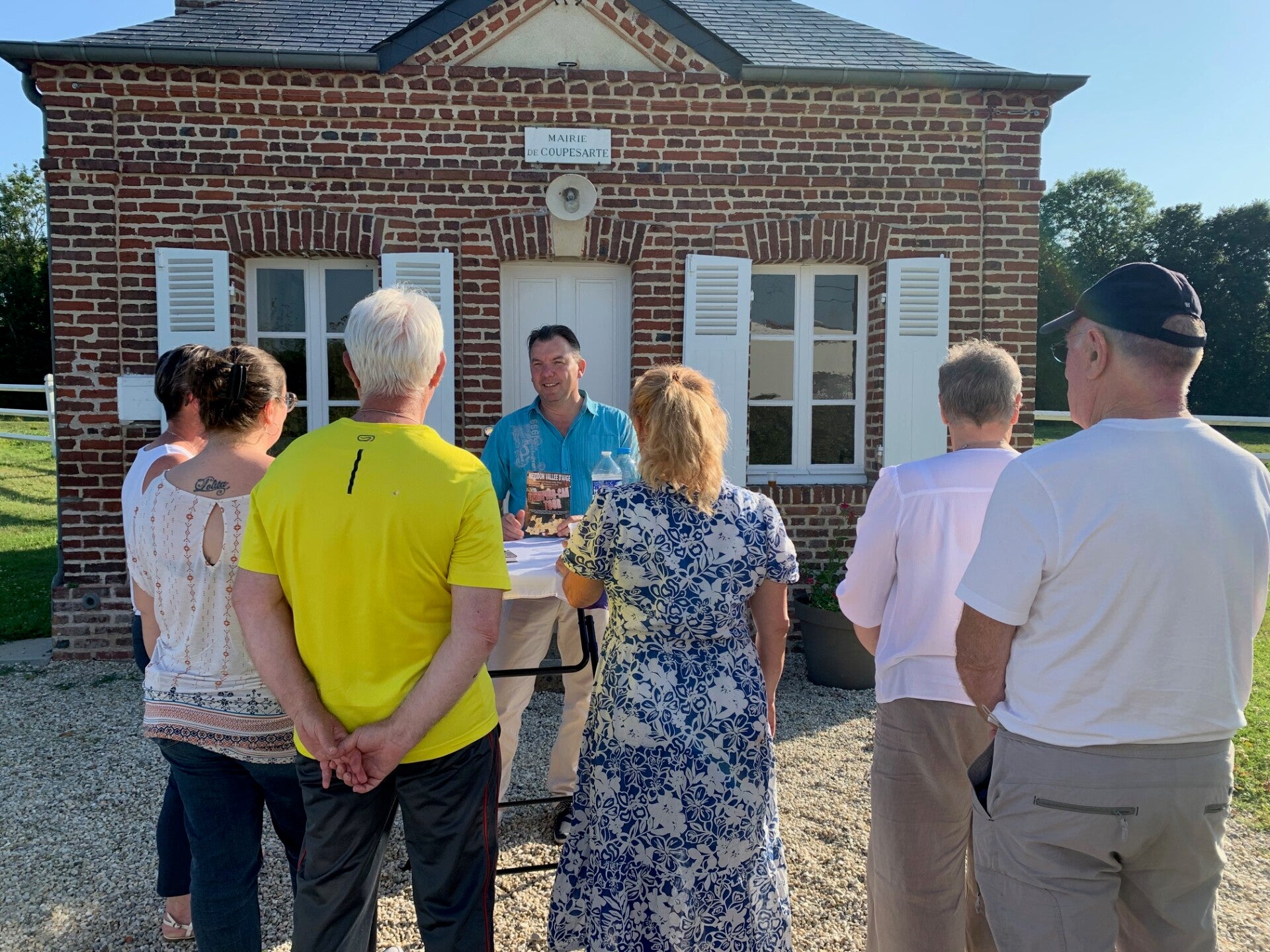 La presse locale a été conviée pour annoncer la candidature de Guillaume LANGLAIS qui a eu lieu sur la place de la Gare. Accompagné par Louis DEFEVER délégué départemental de RN14 et une dizaine de colistiers.