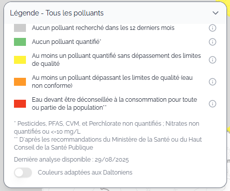 Les cartes "tous polluants" indiquent l'état de la qualité de l'eau potable vis-à-vis des principaux polluants chimiques que nous avons choisi de traiter : pesticides, nitrates, PFAS, CVM et perchlorates . Des cartes spécifiques à chaque polluant sont également consultables.