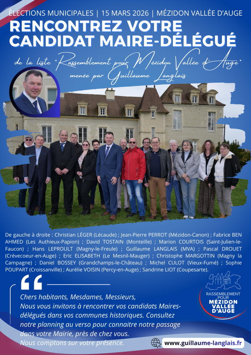 Guillaume LANGLAIS a adressé une lettre aux habitants et aux entreprises pour leur annoncer son intention de se porter candidat aux élections municipales et communautaires de Mézidon Vallée d'Auge du 15 mars 2026.